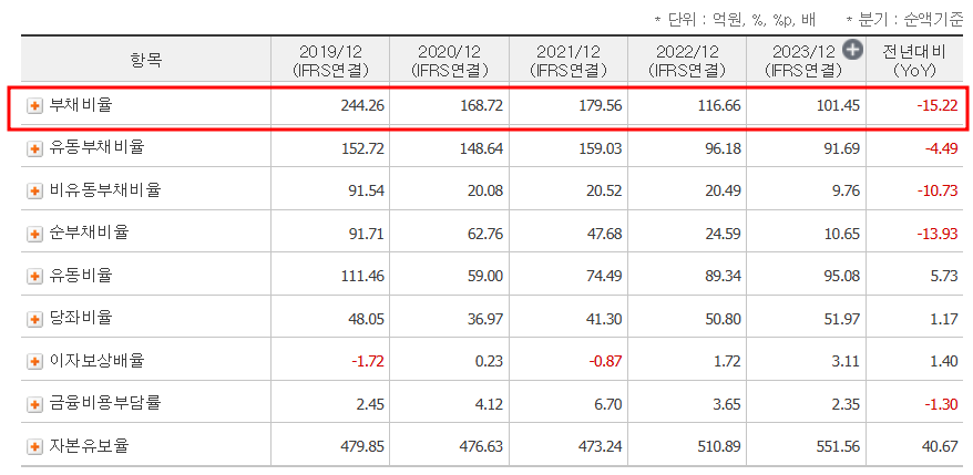 부채비율이 지속적으로 감소(2019년 244.26% → 2023년 101.45%)하며 안정적인 재무구조를 유지하고 있습니다. 이는 추가적인 투자 및 성장 전략 추진에 유리한 환경을 제공합니다.