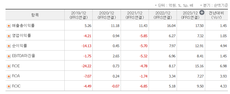 2021년 적자를 기록했던 영업이익은 2022년부터 흑자 전환(111억 원)에 성공했으며, 2023년에는 179억 원, 2024년에는 318억 원으로 크게 증가할 전망입니다.