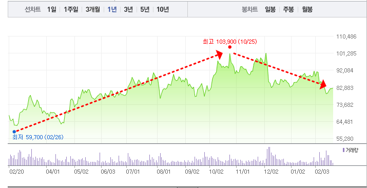KB금융은 국내 대표 금융지주사로서 코스피 10위권 내 시가총액을 보유하고 있습니다. 1년간 주가를 살펴보면, 최저 59,700원(2024년 2월 26일)에서 최고 103,900원(2024년 10월 25일)을 기록하며 변동성을 보였습니다. 최근 주가는 약 82,400원 수준으로 안정적인 흐름을 유지하고 있습니다.