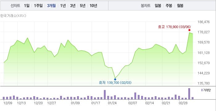 다만, 3개월 기준으로 보면 최저가 이후 지속적으로 상승추세에 있으며 3월 6일 3개월 최고가인 178,900원을 기록했습니다.