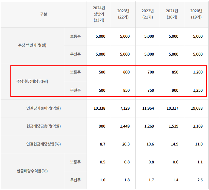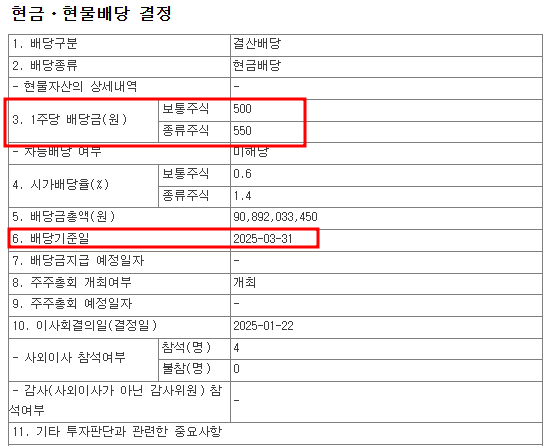 | 1주당 배당금 | 보통주 500원 / 우선주 550원 |