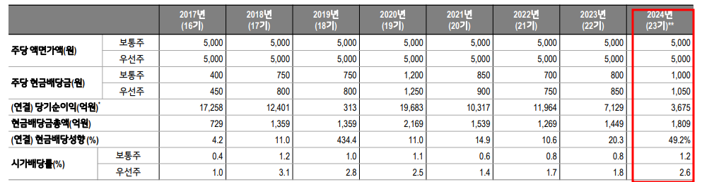 | 연도 | 1주당 배당금 (보통주, 원) | 배당 수익률 (%) |