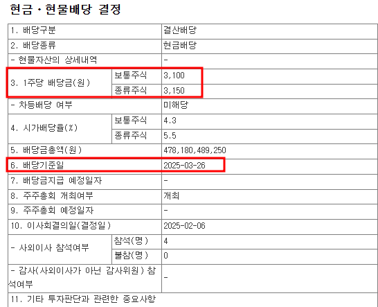 | 1주당 배당금(원) | 3,100원 (보통주 기준) |