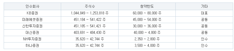 이 중에서 대표주간사인 KB증권의 배정 물량이 가장많고 청약한도는 약 60,000~80,000주가 될 것으로 예상하고 있습니다.