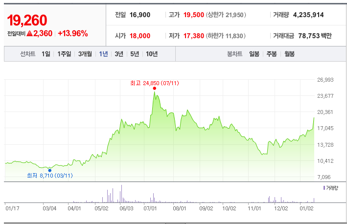 주가는 2024년 7월 11일에 기록한 최고가 24,850원에 비해 다소 낮은 수준이지만, 최근 거래량이 급증하며 상승세를 이어가고 있습니다.
