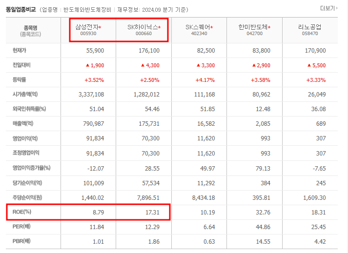 예를 들어, 같은 반도체 산업에 속한 두 회사의 ROE를 비교할 때, 한 회사가 다른 회사보다 높은 ROE를 기록하고 있다면 이는 더 나은 수익성과 경영 효율성을 나타냅니다. 단, 단기적인 ROE 수치만을 기준으로 삼아서는 안 되며, 장기적인 추세를 함께 고려해야 합니다.