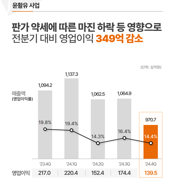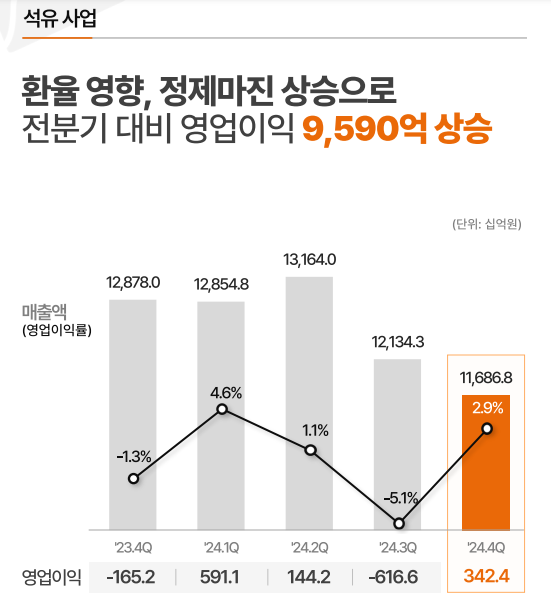 사업별 실적을 살펴보면 석유사업은 매출 49조8399억 원, 영업이익 4611억 원으로 가장 높은 비중을 차지했습니다. 윤활유사업 역시 매출 4조2354억 원, 영업이익 6867억 원으로 안정적인 수익성을 유지했습니다.