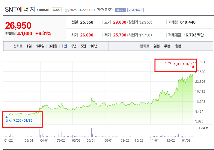 SNT에너지는 산업용 열교환기 및 압력용기 제조업체로, 최근 LNG 프로젝트 수주 확대와 산업 성장성 덕분에 주가가 상승세를 보이고 있습니다. 2025년 1월 22일 기준으로 SNT에너지의 주가는 26,750원, 전일 대비 1,400원(+5.52%) 상승했습니다.