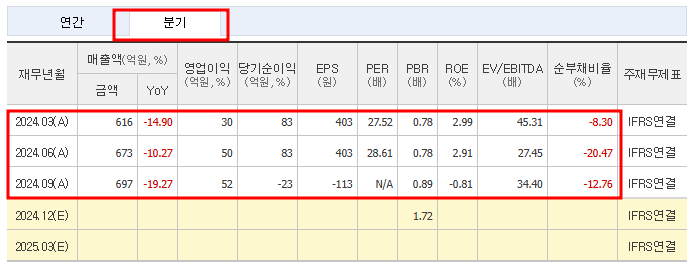 - 3분기 매출: 697억 원, 영업이익 52억 원