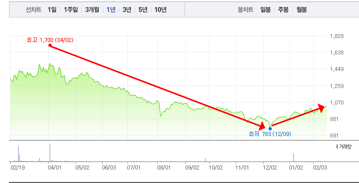 - 52주 최고가/최저가:1,700원/783원