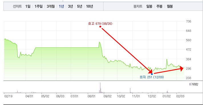 - 52주 최고가/최저가: 679원/251원
