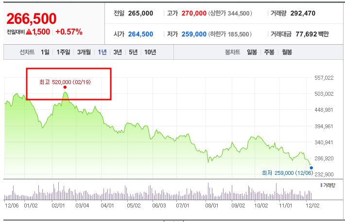 • 52주 최저가: 259,000원 (2024년 12월 6일)