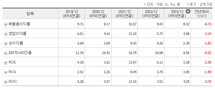 2023년에는 전년 대비 영업이익률과 순이익률이 감소했으며, 이는 글로벌 경기 둔화와 원자재 가격 상승 등 외부 요인의 영향을 받은 결과입니다. 그러나 2024년부터는 철강 사업 외의 신성장 사업의 성과가 본격적으로 나타날 것으로 예상됩니다.