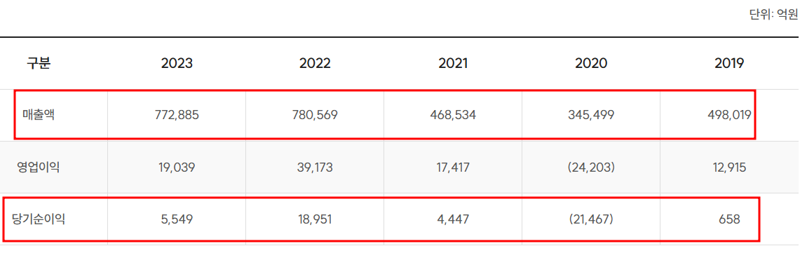 - 2022년 매출: 78조 569억 원, 영업이익 3조 9,173억 원, 당기순이익 1조 8,952억 원.