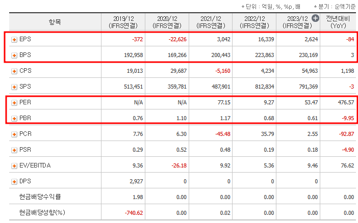 - PBR(주가순자산비율): 0.54배로, 저평가된 상태로 볼 수 있음.