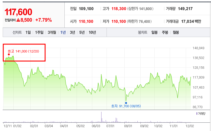 - 52주 최고가/최저가: 최고 141,000원(2023년 12월 20일), 최저 91,700원(2024년 8월 5일).