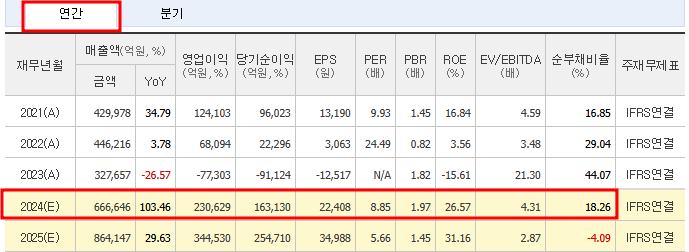 그러나 2024년에는 매출이 666,646(억)으로 103.46% 증가할 것으로 예상되며, 영업이익도 230,629(억)으로 흑자 전환할 것으로 보입니다. 당기순이익 역시 163,130(억)으로 대폭 개선될 것으로 전망되며, 이는 반도체 수요 회복과 가격 상승이 주요 요인으로 작용할 것입니다.