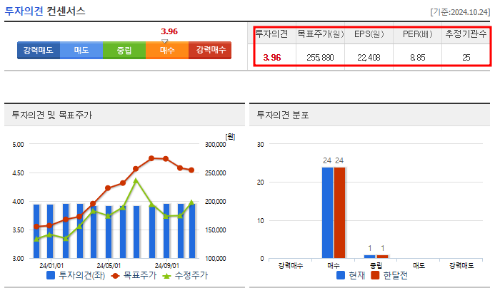 SK하이닉스에 대한 투자 의견은 "매수"로, 평균 목표 주가는 255,880원입니다. 이는 현재 주가 대비 약 27%의 상승 여력을 나타냅니다. 25개의 기관에서 예상한 EPS(주당순이익)는 22,408원, PER(주가수익비율)은 8.85배로 평가됩니다. 이와 같은 수치는 SK하이닉스가 향후 수익성 면에서 긍정적인 성장을 할 것이라는 기대감을 반영합니다.